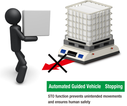Equipped with the STO (Safe torque off) function* that cuts off the power supply to the motor. Prevents unintended operation of the equipment and reduces risks by shutting off the power supply to the motor.