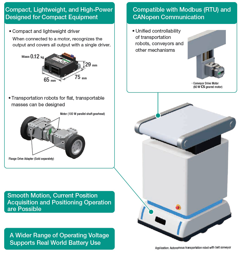 The BLV Series R Type brushless DC motor (BLDC motor) speed control system offers the design of motor and driver significantly reduced in size and weight, yet high-power, and contributes to the battery driven automation.