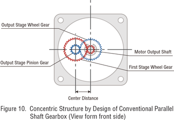 Figure 5 shows the structure of a parallel shaft gearbox of a parallel gear reduction mechanism. The gear output shaft of parallel shaft gearboxes is arranged avoiding the motor output shaft. Therefore, a structure in which the gear output shaft is off set from the center is commonly used. Arranging as large a gear as possible in the output stage enables to obtain a high allowable torque and design gearboxes with various gear ratios. The off set amount should be carefully considered because it is closely related to the gear design (see Figure 6).