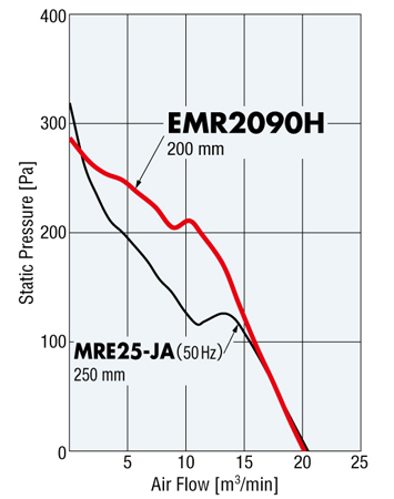 It greatly exceeds the air flow of conventional AC axial flow fans and has cooling capacity equivalent to a fan with a frame size 250 mm which is one size larger. Solve thermal problems with customer equipment caused by high heat generation and high density.