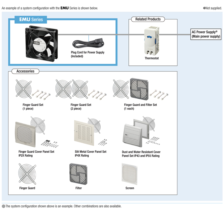Thermostats (sold separately) make it possible for fans to operate only when cooling is necessary. Thermostats provide energy-saving by automatically stopping fans for example, at night, when the amount of heat generation declines following the load rate's decline in equipment, or in winter, when the ambient temperature drops and forced cooling is not necessary.
