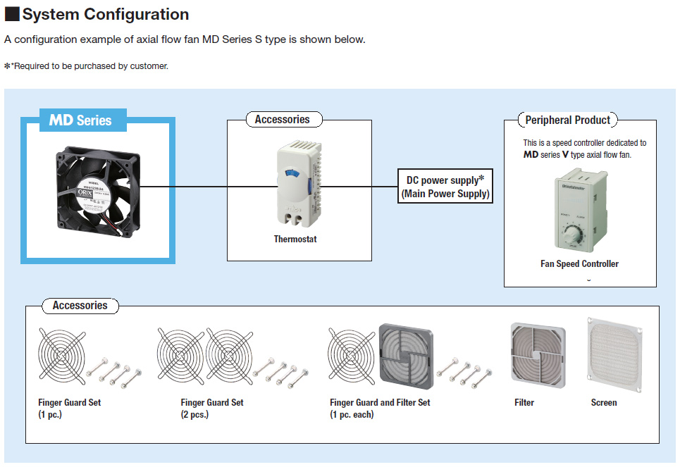 Thermostats (sold separately) make it possible for fans to operate only when cooling is necessary. Thermostats provide energy-saving by automatically stopping fans for example, at night, when the amount of heat generation declines following the load rate's decline in equipment, or in winter, when the ambient temperature drops and forced cooling is not necessary.
