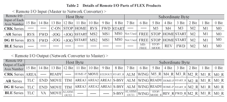 The memory range largely consists of two groups; one is the "remote I/O" which is used for motor control, and the other is the "remote register" which reads and writes operating data (traveling amount and speed) and parameters. The remote I/O has all of the driver's I/O information beneath the network converter. Its purpose is to reduce the overall system cost by controlling multiple motors at once with the remote I/O, without increasing the number of host masters.