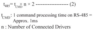 In regard to (3) Overall time delay of RS-485, it becomes greater in proportion to the number of connected drivers, due to the fact that polling is done approximately 1ms cycle per driver. Also, because both (2) and (3) are asynchronous communications, (3)'s RS-485 communication cycle requires up to 2 cycles. Therefore, ③Overall time delay of RS-485 is obtained by the formula (2).